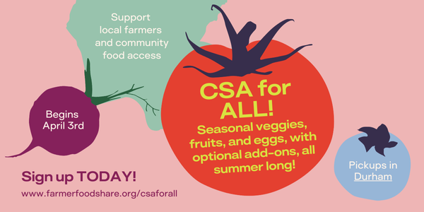 CSA for ALL!, year #3 is here! We can’t wait to feed Triangle communities with farm-fresh produce from NC growers for the 2025 season!